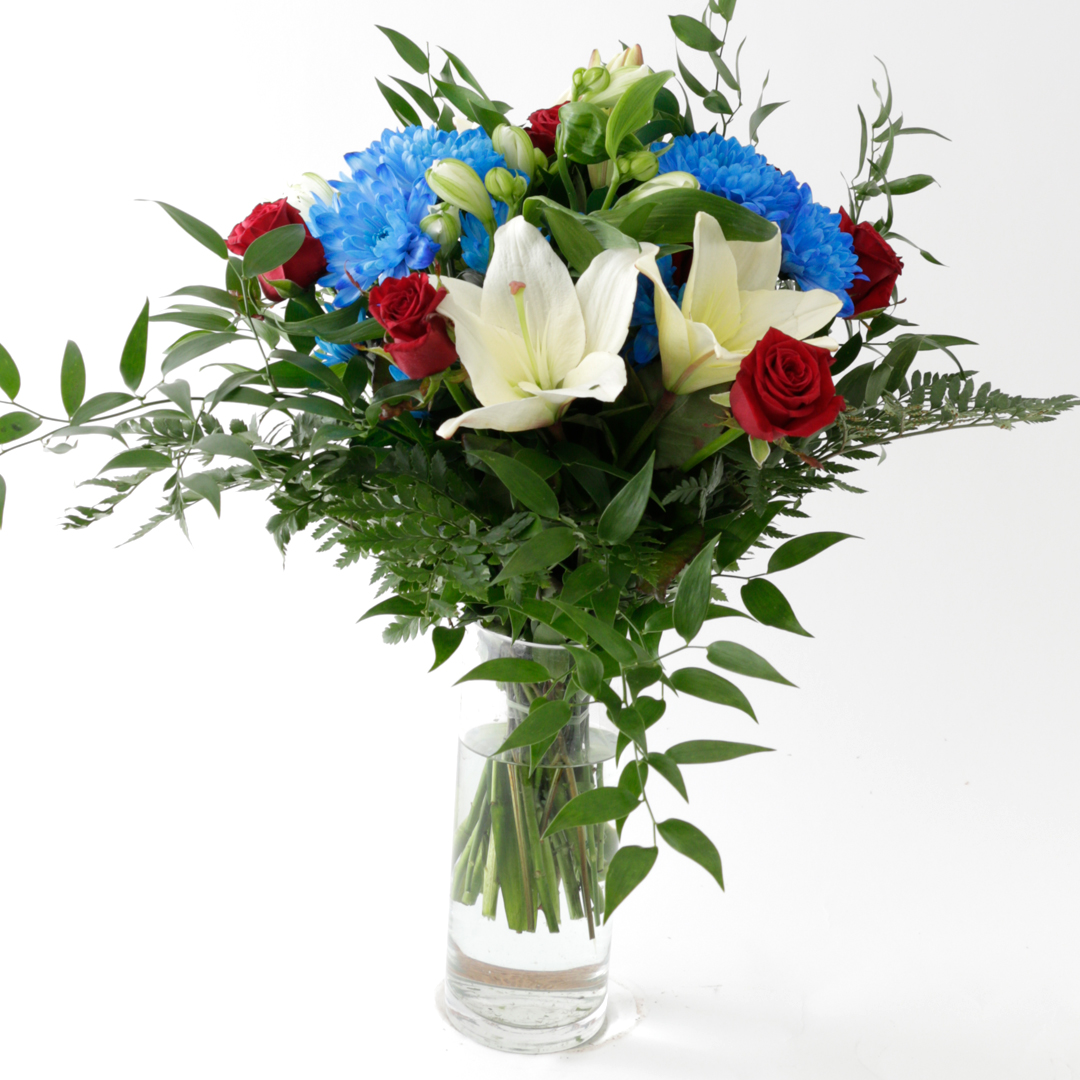 Liljur, sólliljur, rósir og chrysanthemum, fyllt upp með grænu