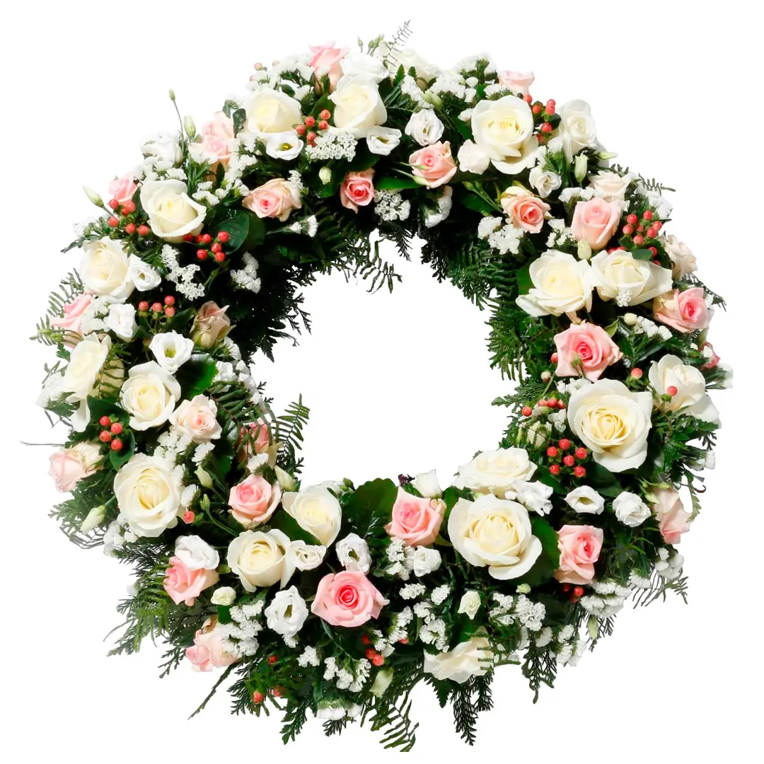 Hringskreyttur útfararkrans með hvítum og ljósbleikum rósum ásamt mismunandi hvítum og bleikum blómum. Innifalið í verði er áletraður borði og akstur í kirkju. 60cm undirlag.