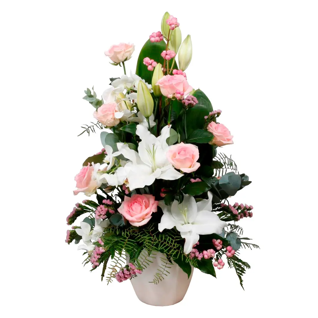Útfararskreyting með ljósbleikum rósum og hvítum liljum ásamt mismunandi hvítum og bleikum blómum. 60cm undirlag.