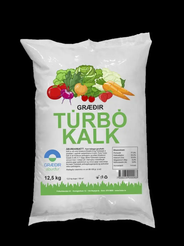 Áburðarbætt Turbokalk Gott er að nota Blákorn og Turbokalk á fallegar grasflatir í upphafi vaxtartímans á vorin, fyrst Turbo kalk til að hlutleysa jarðveginn og síðan Blákorn eftir 5–7 daga. Berið Turbokalk á þrisvar sinnum fram í miðjan júlí. Það eykur mótstöðuafl plantna gegn sjúkdómum og vinnur gegn vexti mosa. Þá bætir Turbo kalk jarðvegsbygginguna og auðveldar loftun jarðvegsins. Efnainnihald: Dólómítakalk (CaCO3 / MgCO3) 77,0% Kalksaltpétur ..........................23,0% samt....100,0 % Í Dólomítkalki og Kalksaltpétur eru eftirfarandi efni: Kalsíum (Ca) 21,0% Magnesíum (Mg) 9,3% Köfnunarefni (N) 3,6%