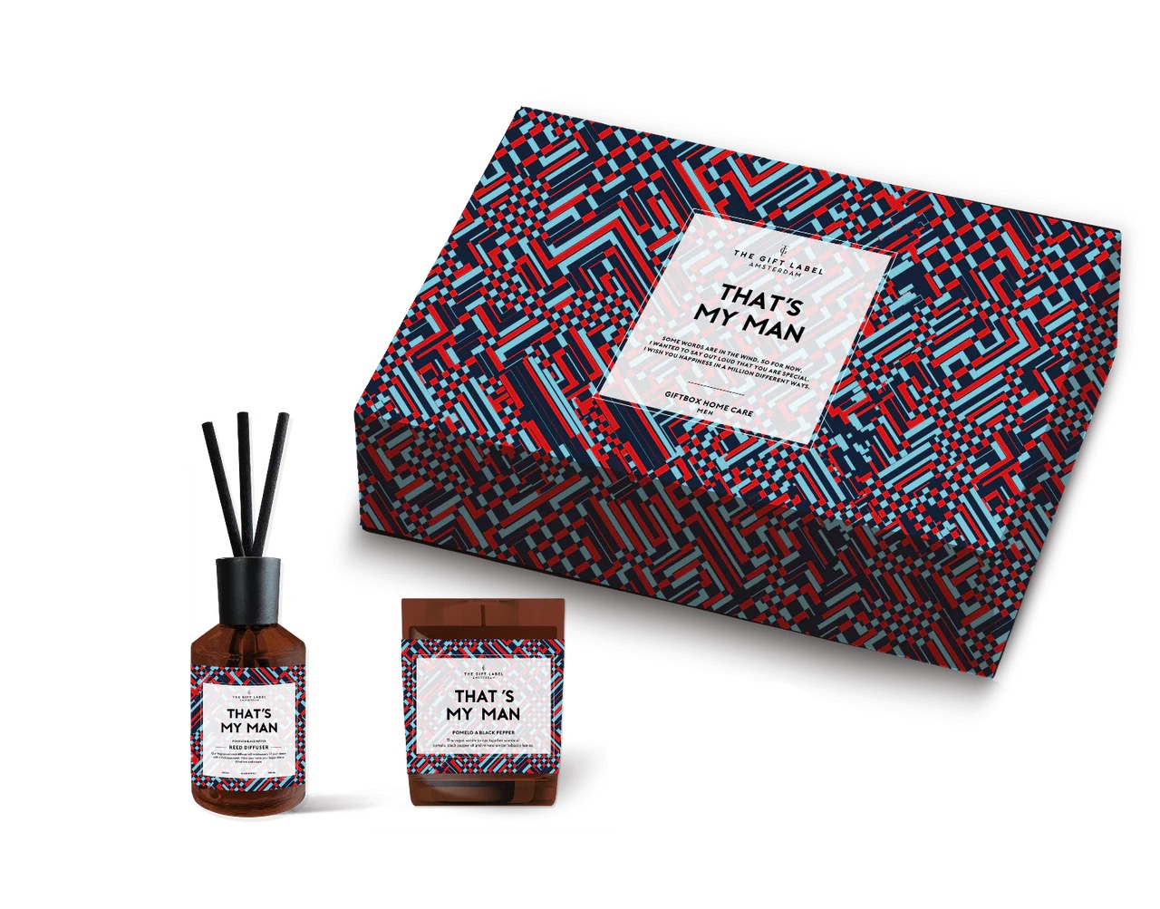 Blá/rauð gjafaaskja með kerti og ilmstöngum