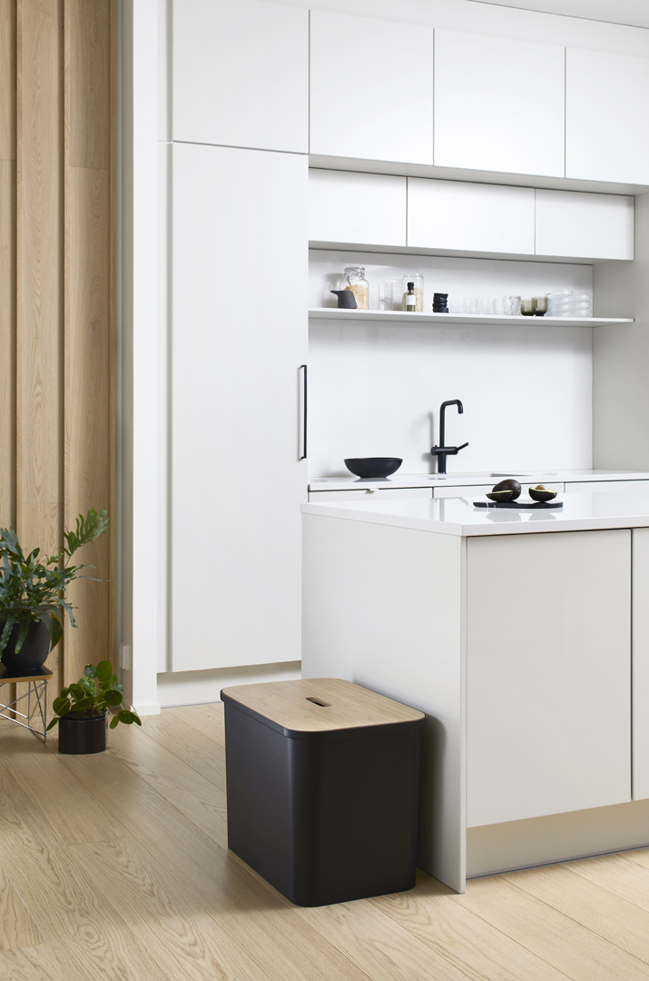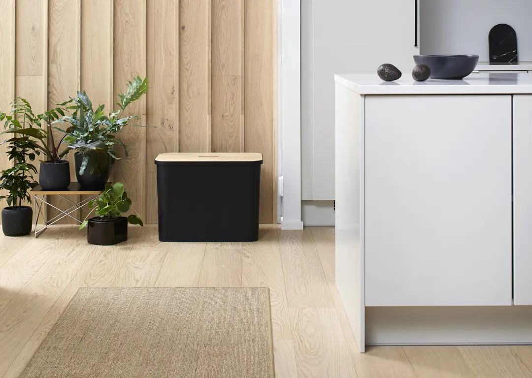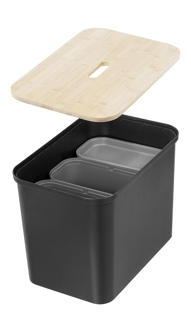 76 lítra ytri fata hvít. 3 stk 13 lítra flokkunartunnur. Bambus lok og plastlok á flokkunartunnur.