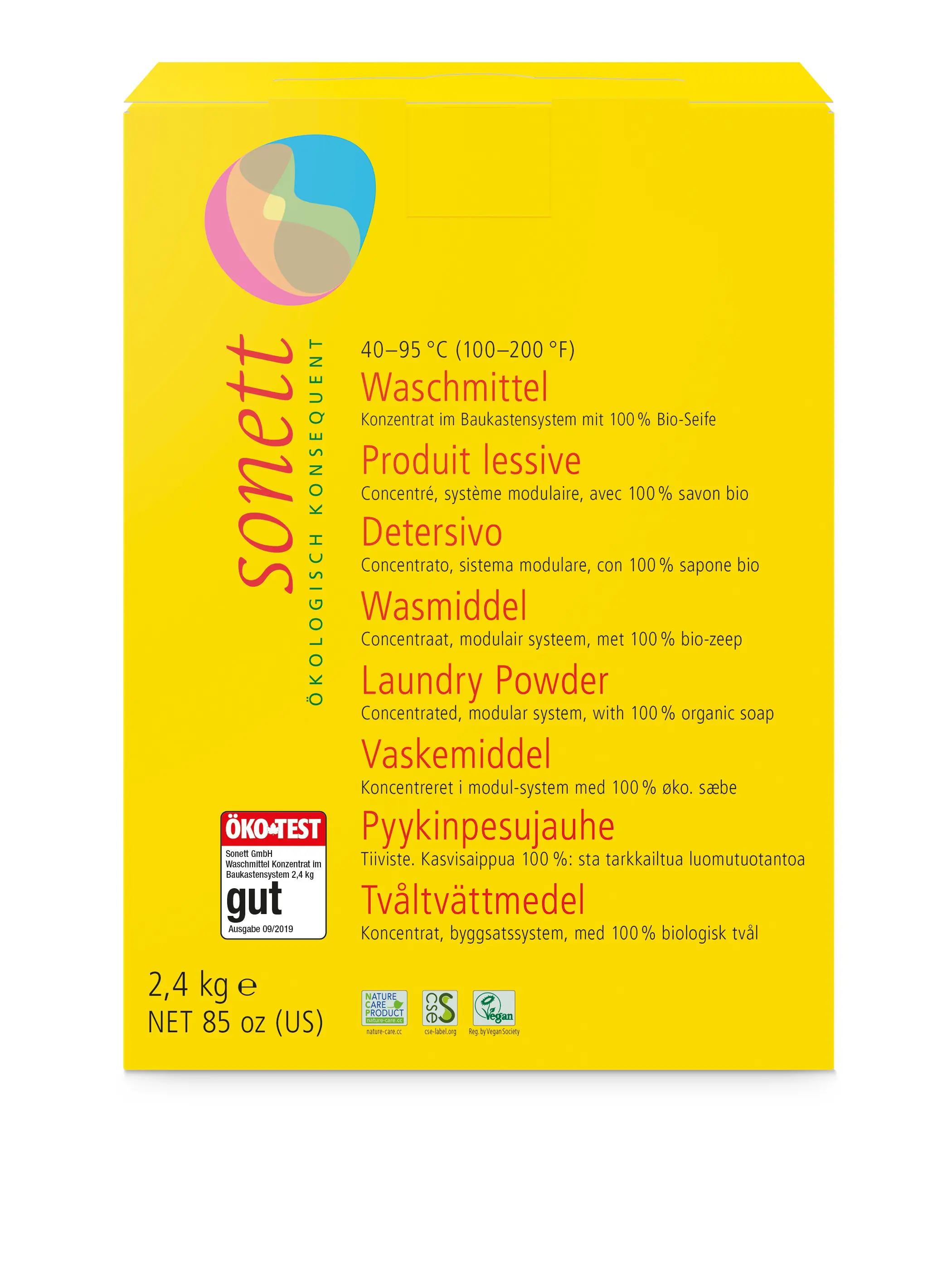 Fyrir allan hvítan og litaðan þvott úr bómull, hör, hampi og gerviefnum. Aðal innhaldsefnin í Sonett þvottaduftinu eru hrein jurtasápa. Öfugt við öll önnur yfirborðsvirk hreinsiefni brotnar sápa niður eftir notkun því hún missir yfirborðsvirku eiginleikana um leið og hún binst kalkinu, sem er alltaf til staðar í frárennsli og sápan brotnar því fullkomlega niður. Með lífrænni sápu úr jurtaolíu, án ensíma og erfðabreyttra efna. Allar olíurnar eru 100% upprunnar frá lífrænni eða líffræðilegri ræktun, 100% niðurbrot. Fáanlegt í 1.2kg, 2,4 kg og 10kg pakkningum.