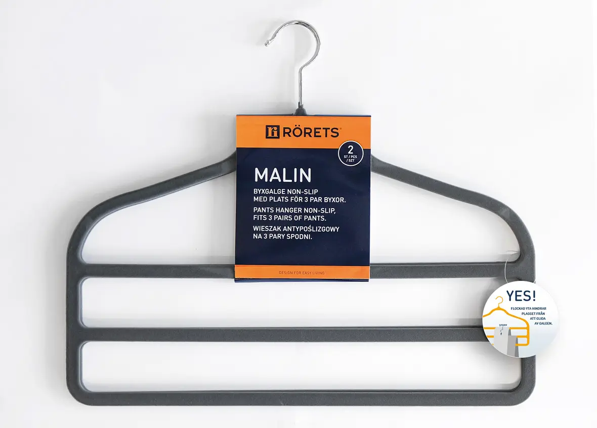 Buxnahengi fyrir 3 buxur. 2 stk í pakka. ABS plast með hrjúfu efni sem kemur í veg fyrir að föt renni til. Tekur lítið pláss í skápnum.