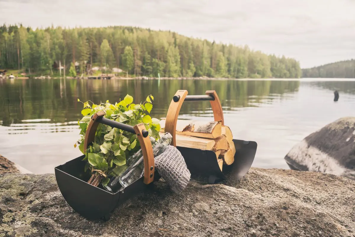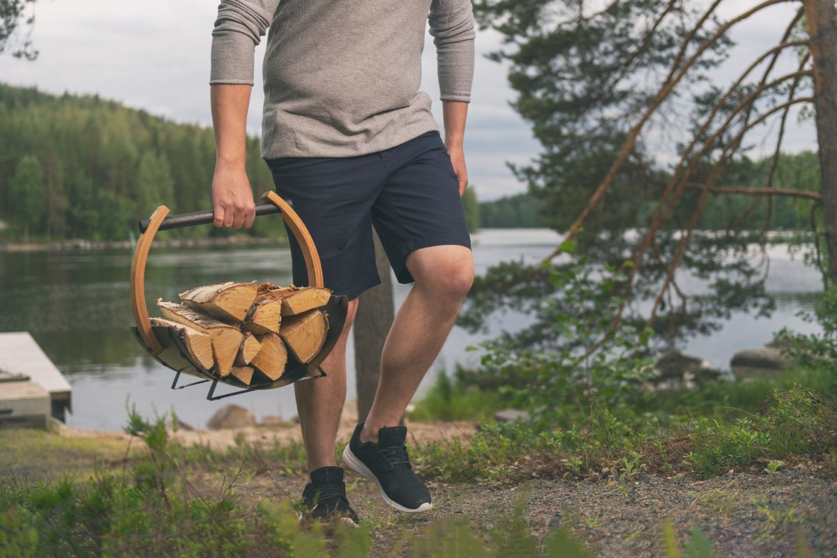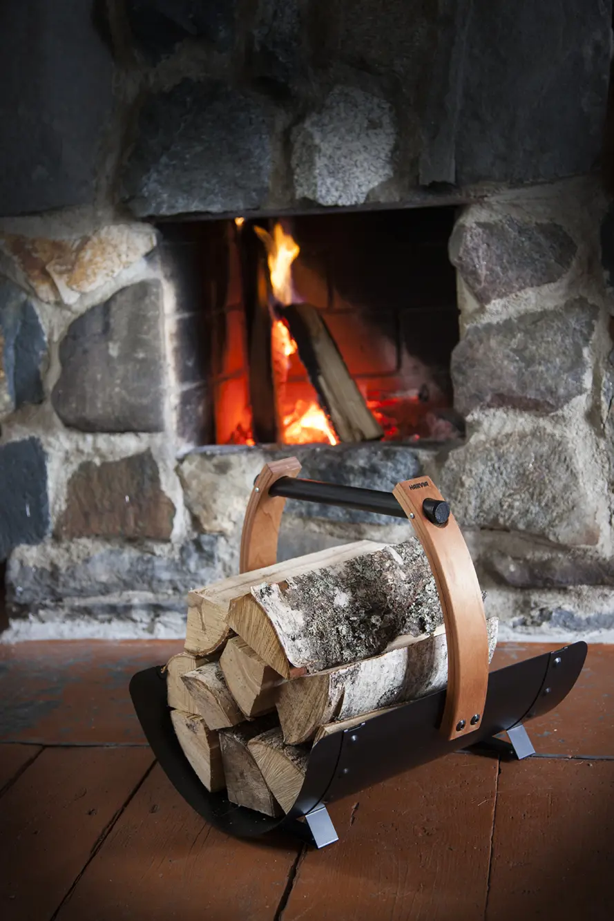 Harvia Legend eldiviðarkarfan er glæsilega samsett úr viði og málmi. Eldiviðarkarfan er tilvalin til að bera eldivið úr skúrnum í sánuna.