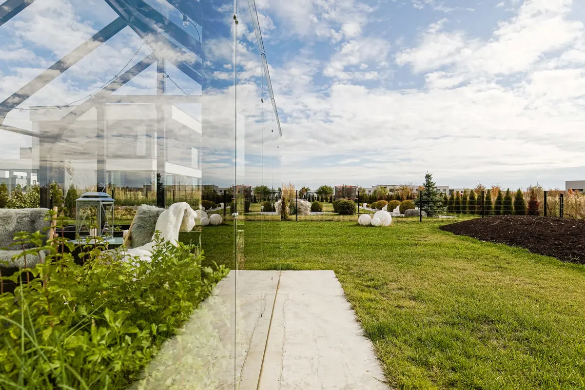 Lengd 495cm Breidd 300cm Mænishæð 290cm Vegghæð 170cm Tvöföld Hurð - 210cm x 140cm Þakhalli 36° Gler - Hert gler 4mm 3x opnanlegir gluggar