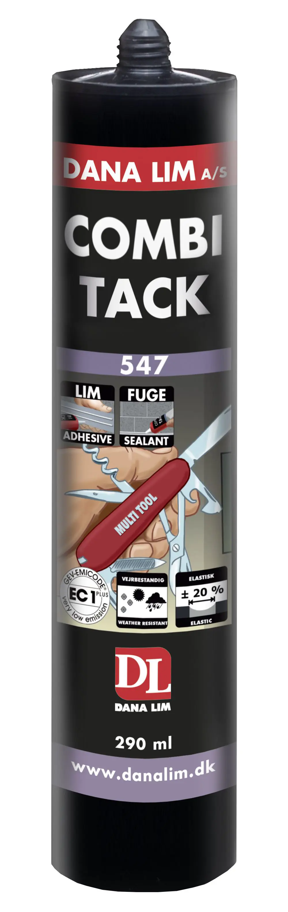 Dana Lim Combi Tack 547 er hlutlaust, lyktarlaust og rakaherðandi lím- og fúguefni sem er hannað fyrir krefjandi aðstæður í byggingariðnaði og almennum viðgerðum. Efnið er laust við leysiefni og hentar vel til að líma og þétta flest efni s.s. tré, gler, málm og flestar tegundir plasts.