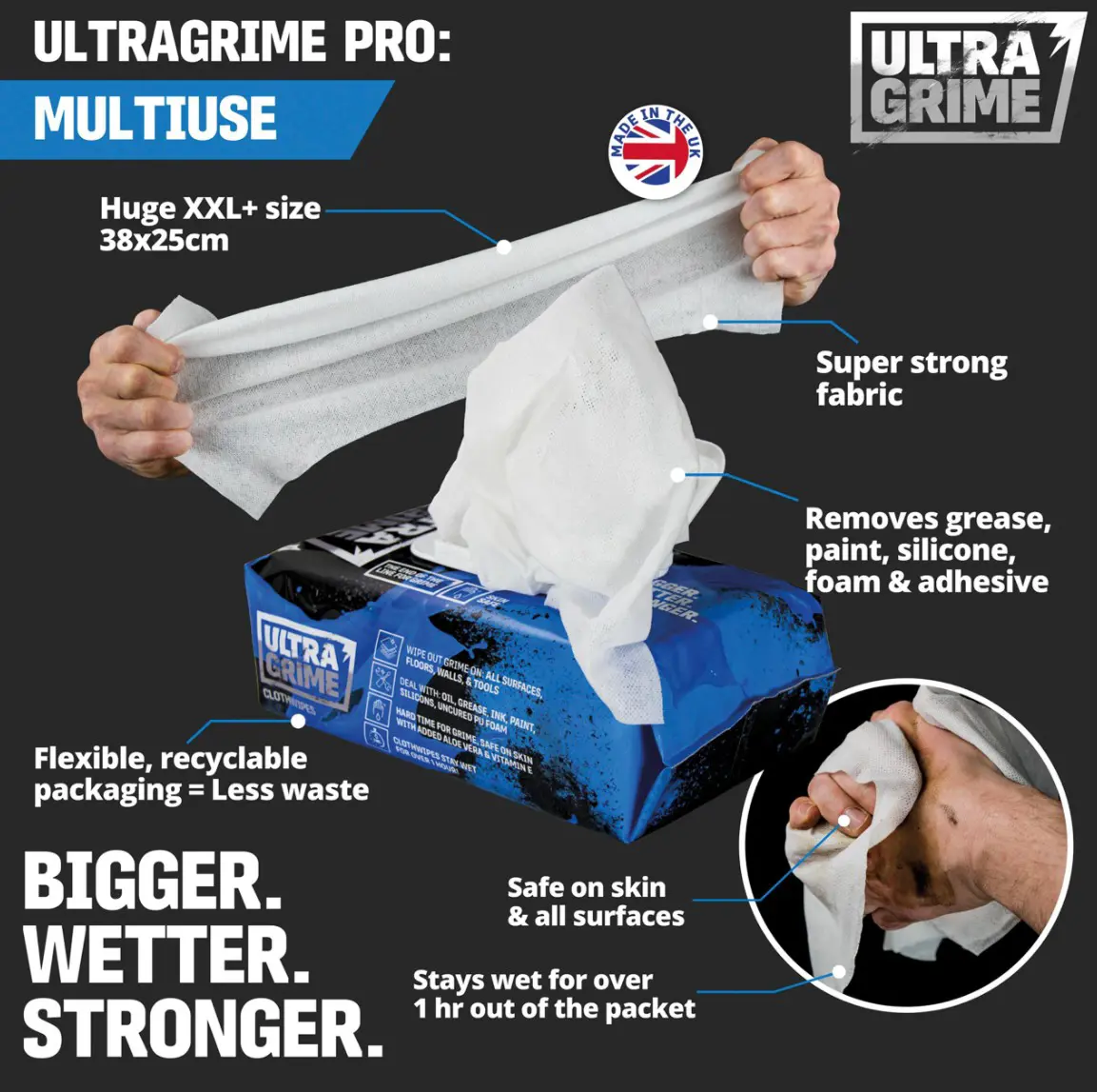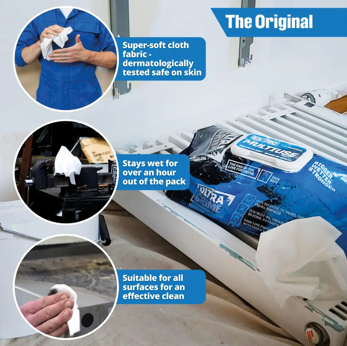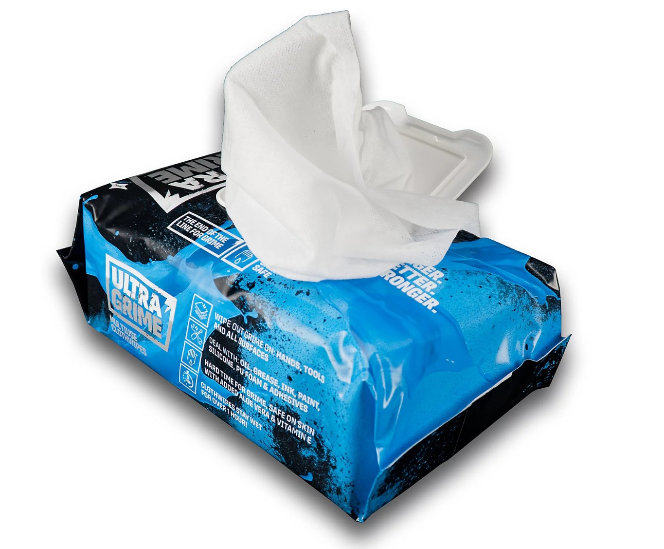 Eiginleikar og kostir Ofurmjúkar, sterkar og drægnar þurrkur sem eru öruggar í notkun á öllum yfirborðum Kemur í stórri stærð, sem hjálpar til við að hylja meira yfirborð með aðeins einni þurrku (38cm x 25cm) Haldast blautar og nothæfar í meira en klukkutíma úr pakkningunni Fjarlægir fitu, málningu, sílikon, óherta PU froðu og lím Húðfræðilega prófað - Öruggt á húð Sterkar, sveigjanlegar, endurvinnanlegar umbúðir. Yfir 77% minna plast en venjulegir umbúðir.