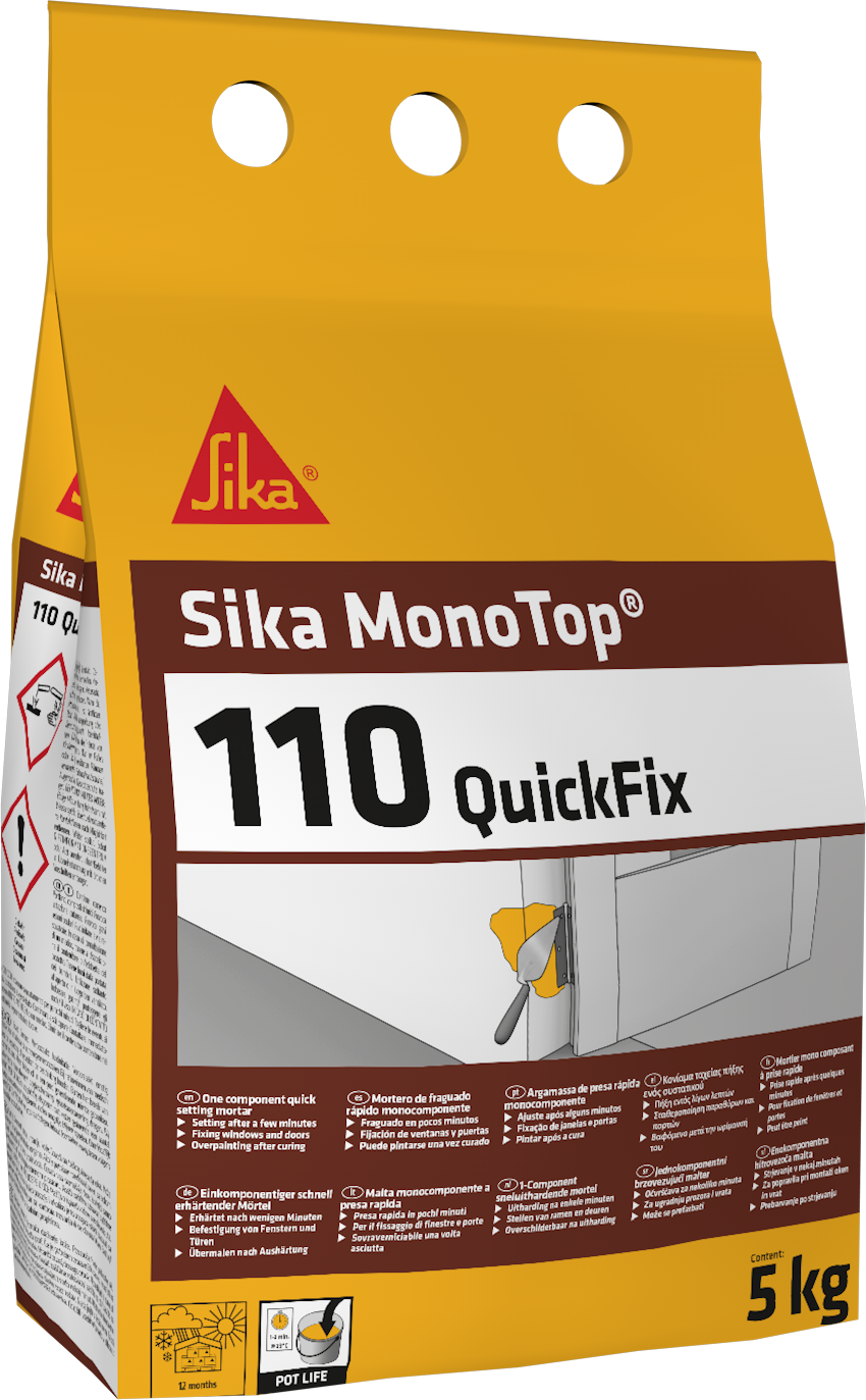 Sika MonoTop-110 QuickFix er sementsbundinn hraðmúr sem er tilbúinn til notkunar og þarf einungis að blanda með vatni. Múrinn er hannaður til að ná styrk mjög hratt og harðnar á örfáum mínútum, sem gerir hann kjörinn til að festa íhluti eins og bolta, rör, festujárn og hillubera í steypu og múrverk.