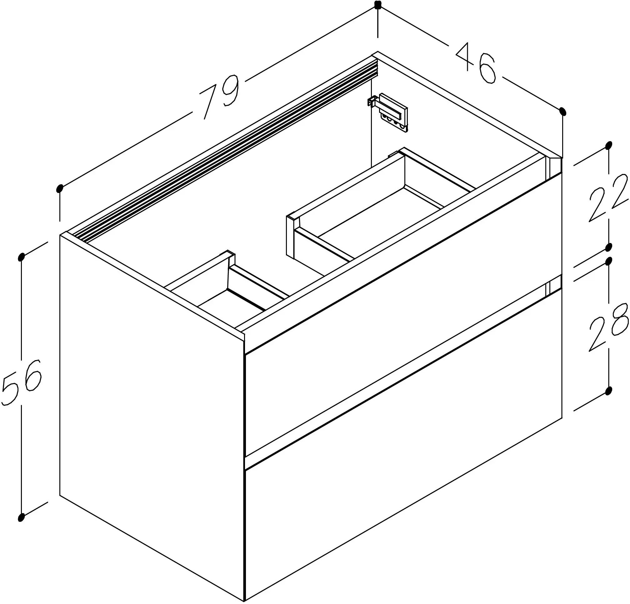 Vandaður vaskaskápur með tveim mjúklokandi skúffum. Hentar vel í minni baðherbergi. Innrétting kemur samsett. H56xD45,5xB79