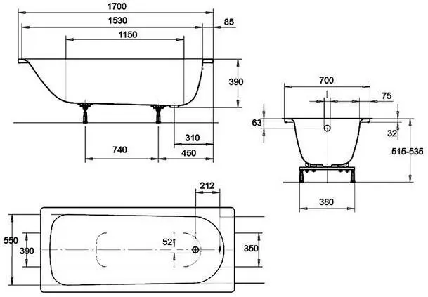 Kaldewei model 312-1 Stálemulerað bað Lengd 1700 mm Breidd 700 mm Hæð 390 mm Þykkt á stáli 23 mm Þyngd 50 kg. Fætur seldir sér vnr. 8070192 Fætur: Vnr. 8070192 Nánar hér