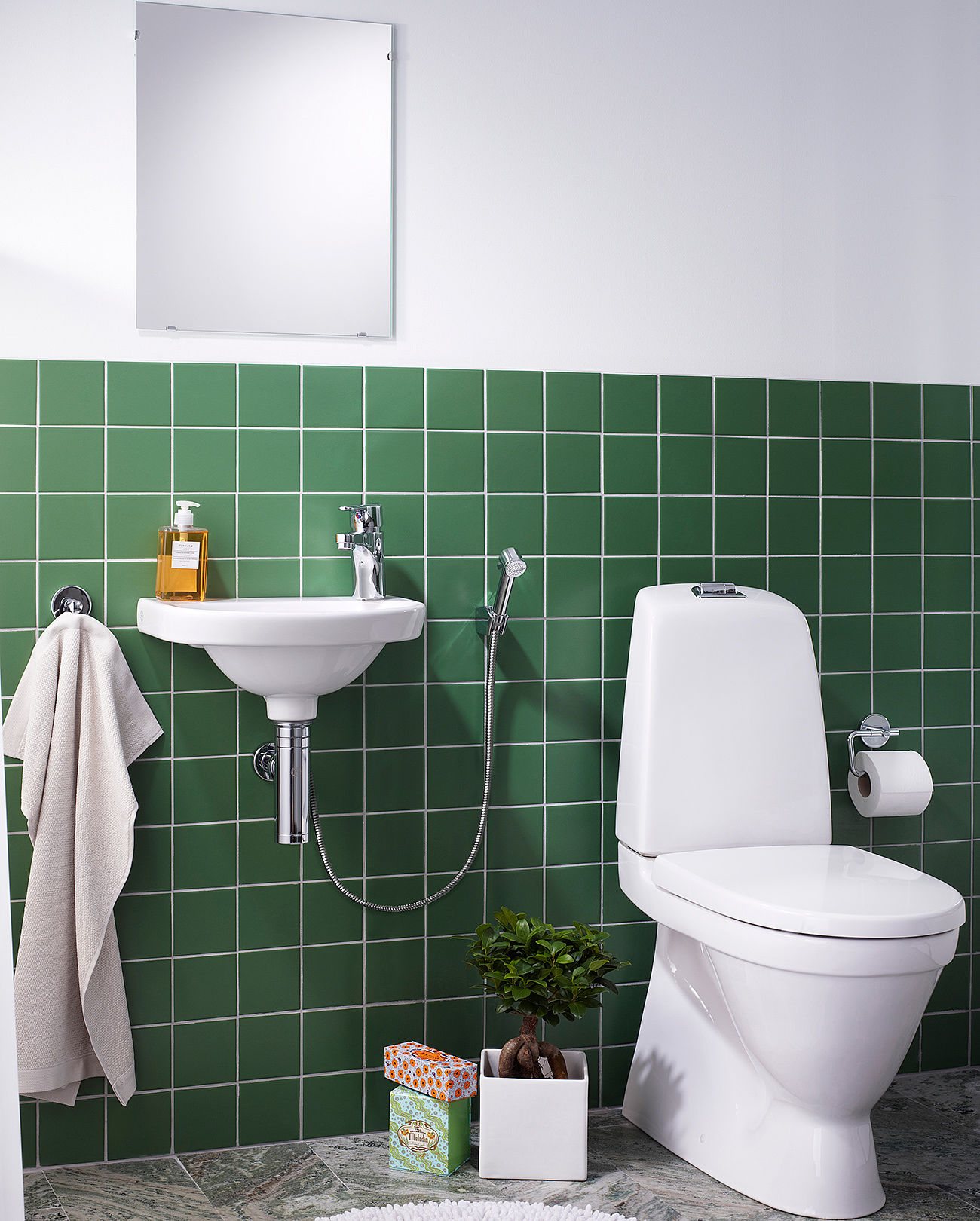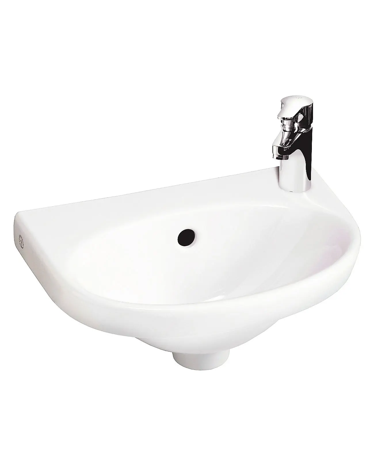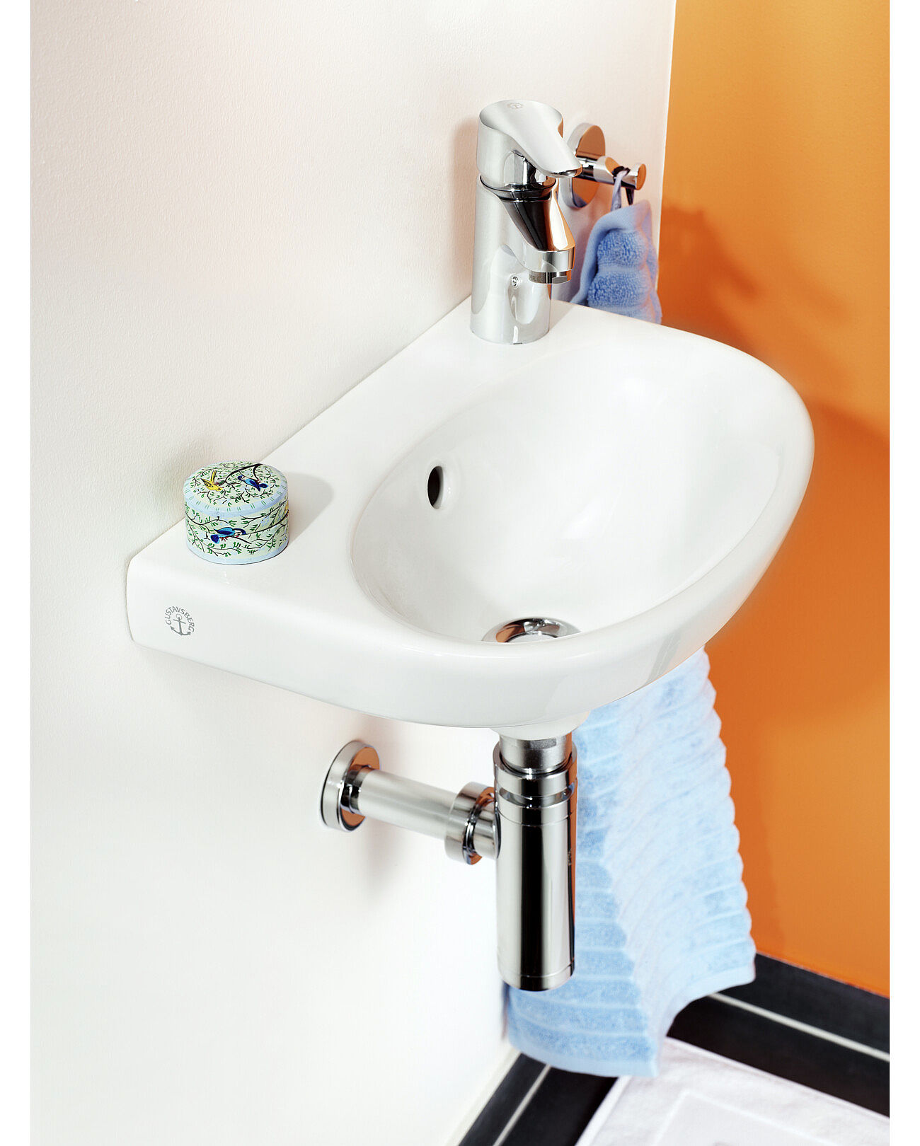 Lítil vegghandlaug frá Gustavsberg með gati hægra megin fyrir blöndunartæki. Þessi tekur ekki mikið pláss. Handlaugartæki á mynd fylgir ekki með.