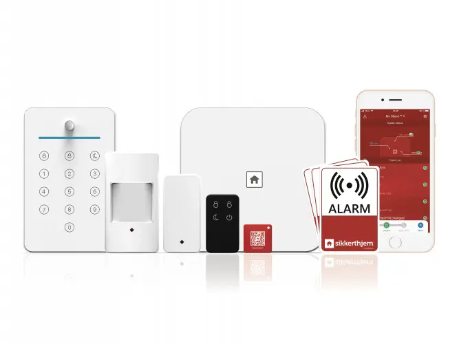 Snjallöryggiskerfi frá Sikkerthjem. Þessi pakki er íbúðarpakki, en það er alltaf hægt að bæta meira við í hann og stækka kerfið eftir þörfum. Í þessum pakka er: 1 x móðurstöð. 1 x lyklaborð. 1 x Lykillæsing á lyklakippu 1 x Hurða/gluggaskynjari 1 x Hreyfiskynjari 1 x fjarstýring. 3 x límmiðar. Þægilegt er að bæta búnaði við, QR -kóði er á öllum aukabúnaði sem auðveldar það að bæta inn búnaði. Kerfinu er stjórnað úr appi sem sett er upp í símanum, ekkert mánaðargjald er til að nota þetta snjallkerfi. Hægt er að setja SIM-kort í móðurstöðina til að hún sé ekki háð því að það sé net á staðnum, þetta hentar vel eins og t.d. í sumarbústaði eða þar sem net er ekki í boði. Einnig er rafhlaða í móðustöðinni og getur hún því haldist gangandi þótt rafmang slái út, en þá lætur móðurstöðina vita að rafmagn hafi rofnað. Allur búnaður nema myndavélar ganga fyrir rafhlöðu og þarf því ekki að leggja að þeim búnaði. Kerfið býður upp á að 3 mismunandi vaktannir, en þær eru: 1. Enginn vöktun, enginn hreyfiskynjari, glugga eða hurðaskynjari er að vakta. 2. Allt kerfi á vöktun. 3. Næturstilling (gæludýrastilling), hreyfiskynjarar setja kerfið ekki af stað við hreyfingu Hægt er að vera með fleiri en ein notnadi í appinu, stjórnandi getur alltaf bæt við notendum og gefið þeim ákveðið leyfi. Hægt er að búa til fyrirfram ákveðna skipanir eins og t.d. að kerfið fari alltaf á vörð kl 23:00 alla virka daga eða að kerfið fari af verði kl 07:00 alla virka daga, hægt er búa til margar svona skipanir.