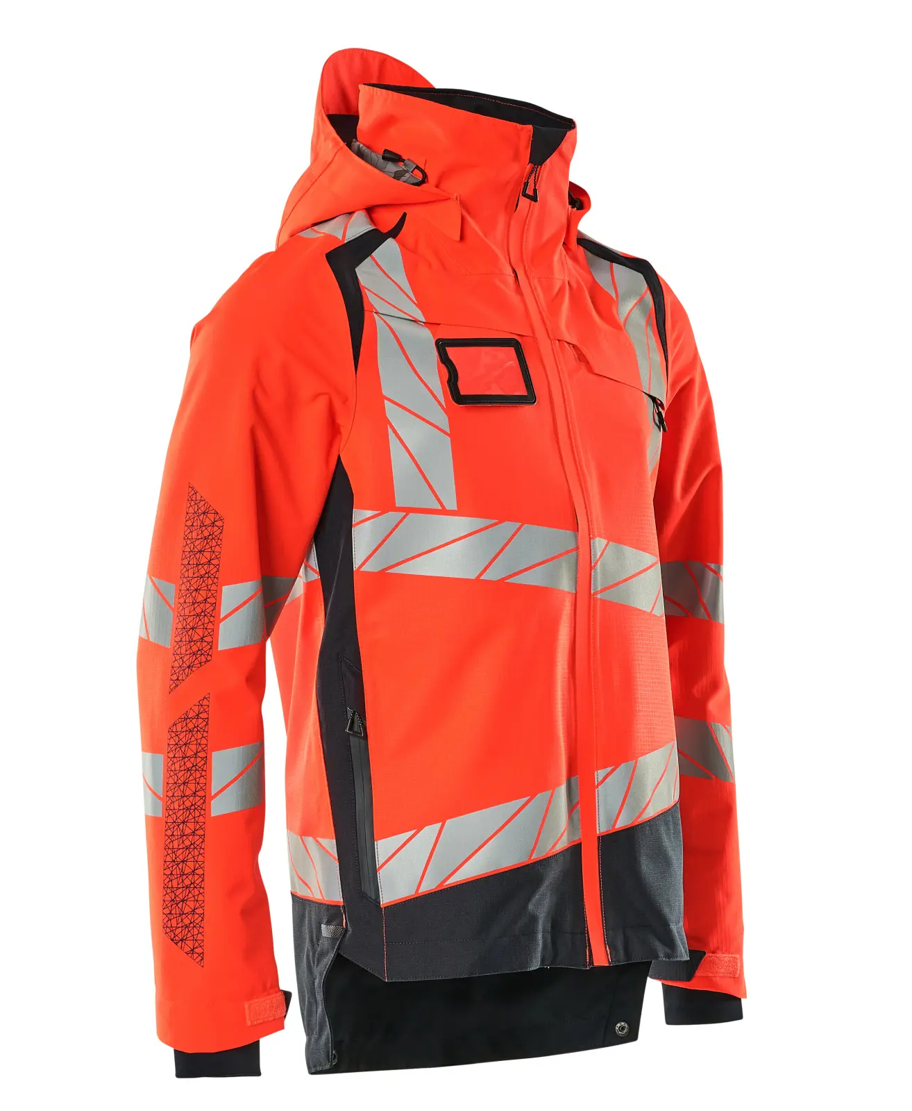 Vatns,-og vindheldur jakki með öndun og sýnileika.