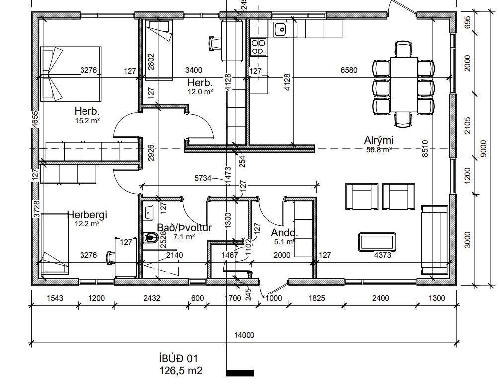 126m² Fullbúið hús tvíhalla þak