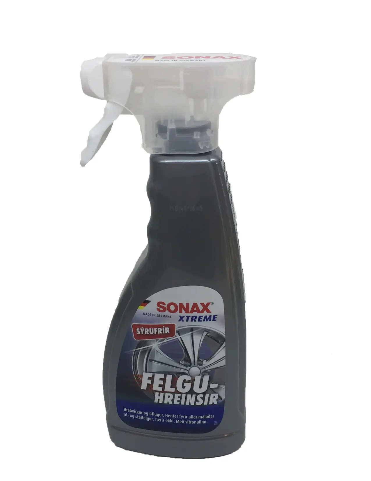 Afar afkastamikill hreinsir án sýru fyrir allar felgur úr stáli og málmblöndum. Fjarlægir án fyrirhafnar þrálát óhreinindi eins og bremsuryk, olíu- og gúmmíleifar og önnur óhreinindi af felgunum.