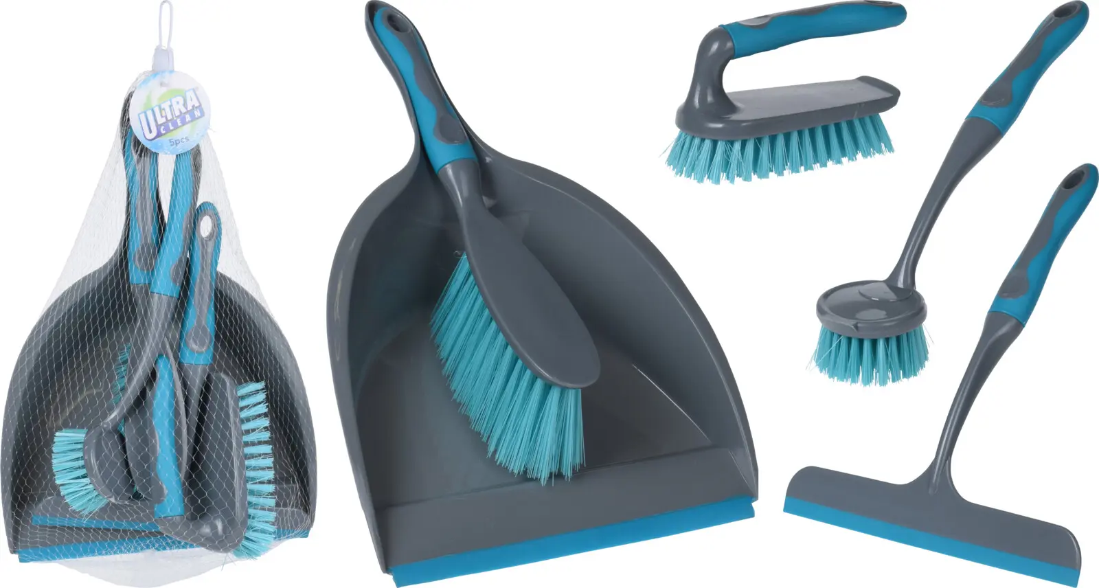 Handsópur og fægisskúffa, handskrúbbur, uppþvottabursti og gluggaskafa. Plast