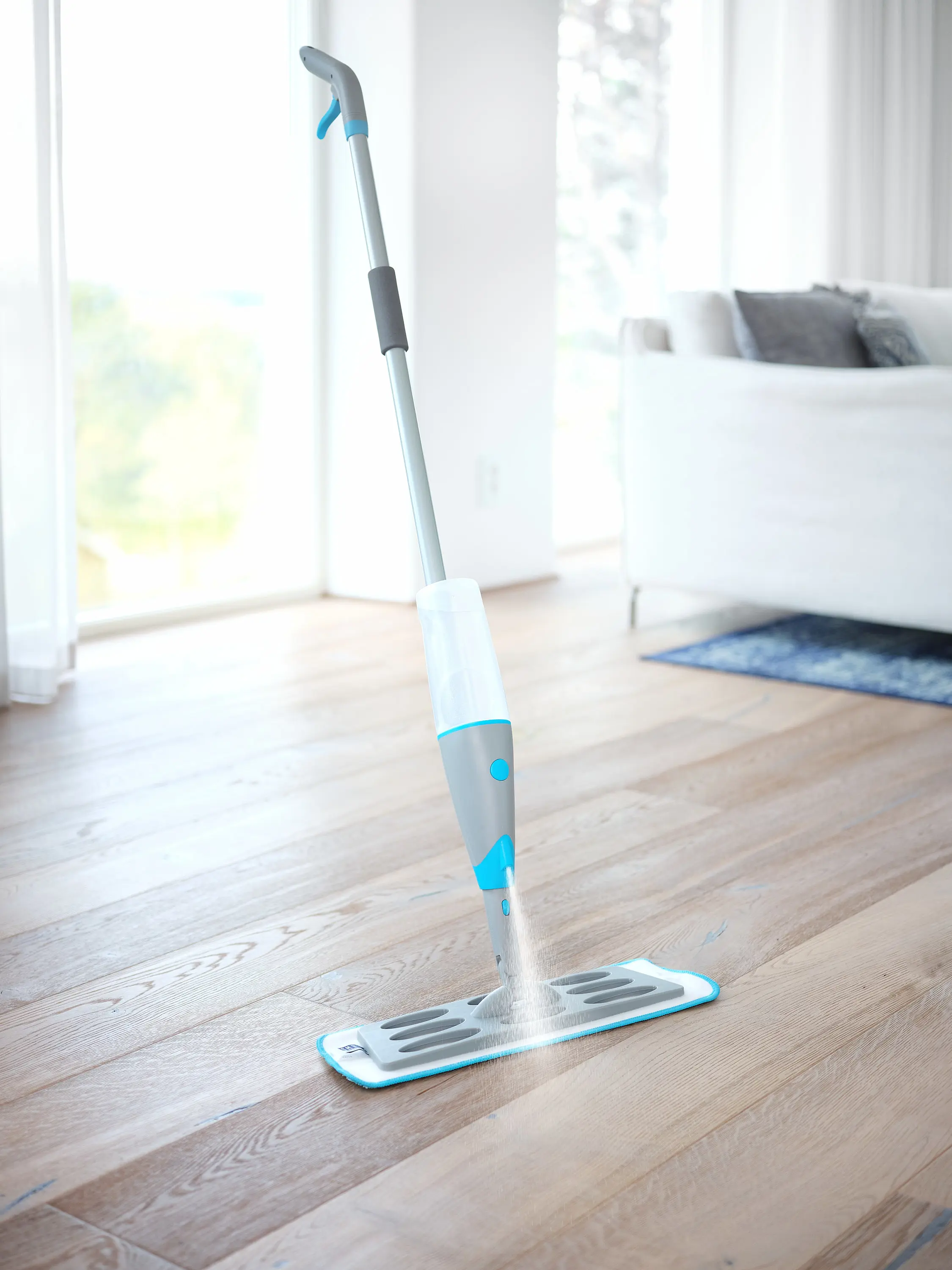 Vatn og sápa sett í vatnstankinn, spreyjað og moppað og gólfið verður skýnandi hreint.