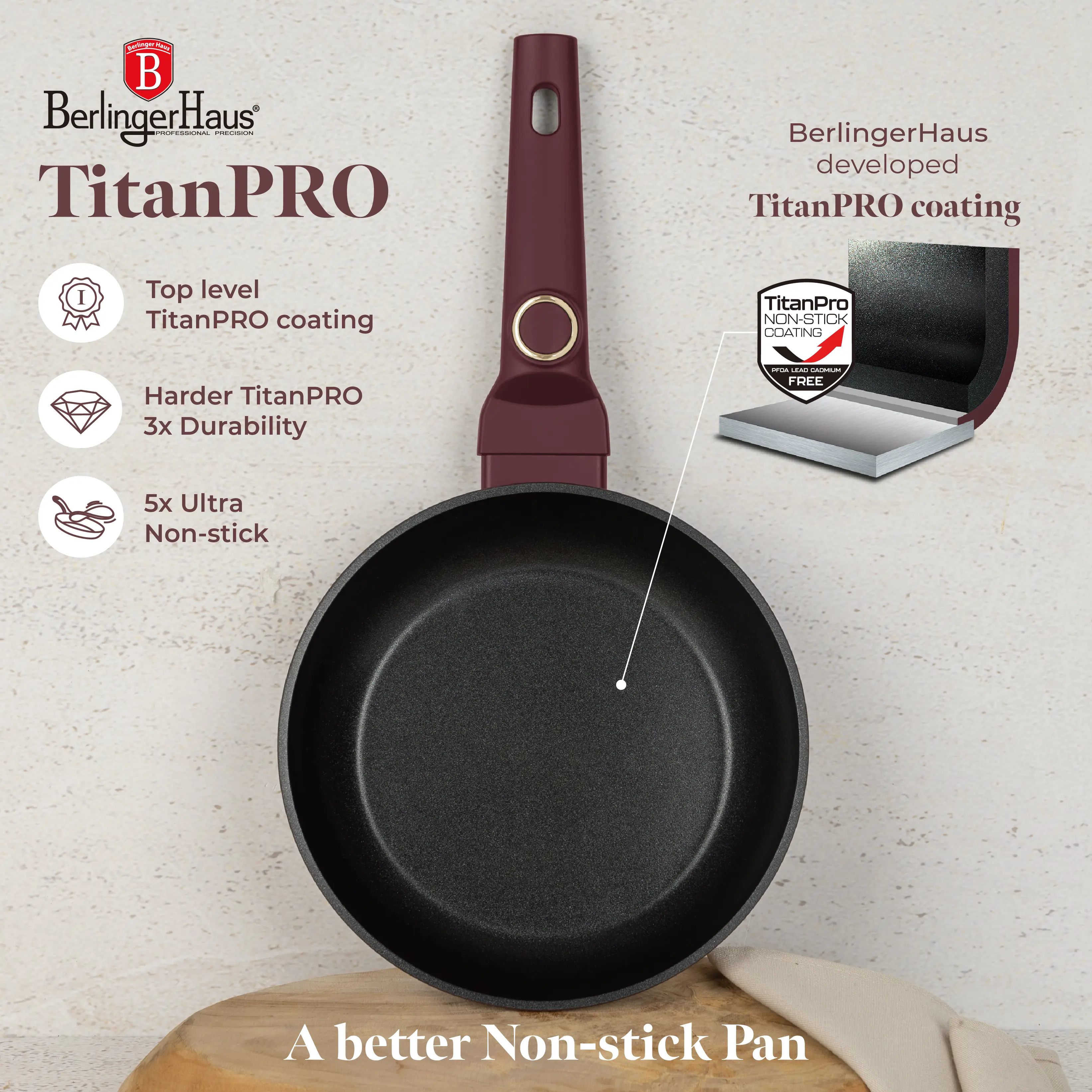 Þreföld endingargóð títan non-stick húðun.