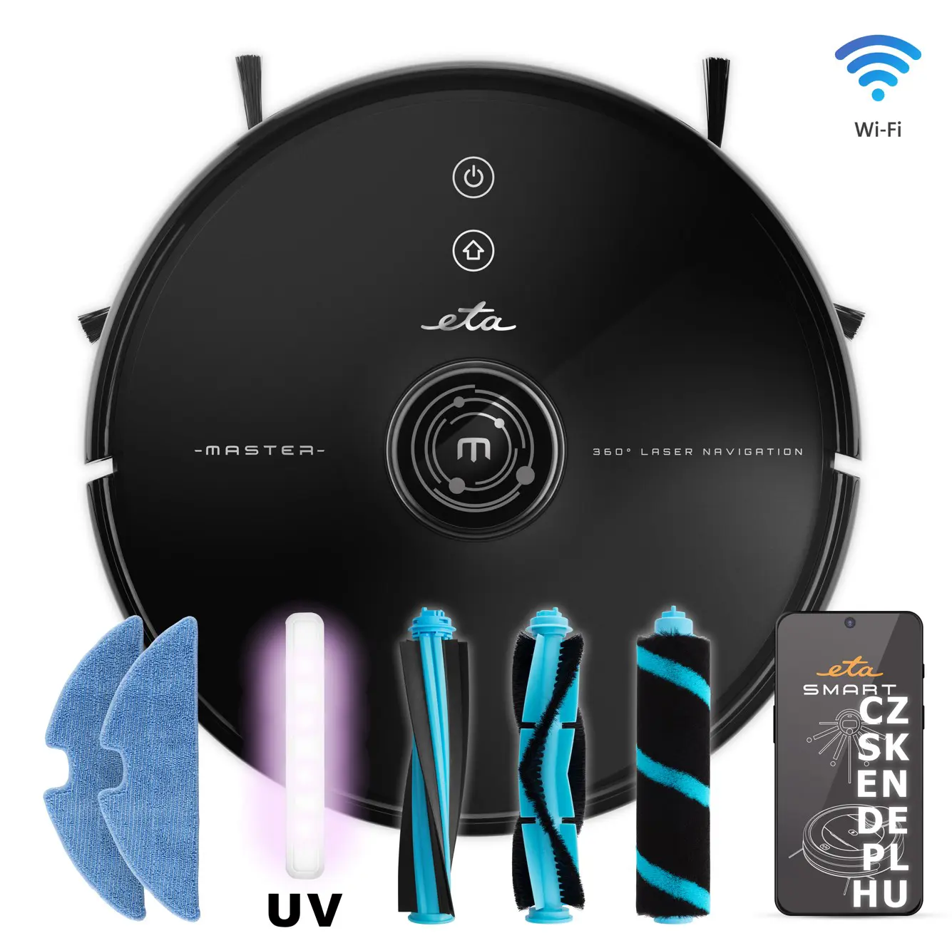 Snjöll leysileiðsögn kortleggur herbergið í fullri 360°. Þökk sé þessu verða heimilisþrif þín mun ítarlegri og skilvirkari . Með 9,7 cm hæð, passar hann þægilega jafnvel undir neðri húsgögn . Slitsterk hjól með drifi vinna bug á ójöfnum og jafnvel allt að 1,5 cm háar skiptingar eru ekkert vandamál . Eftir ryksugun getur ETA Master II einnig þurrkað gólfið . Þú getur auðveldlega stillt styrk raka í forritinu í samræmi við núverandi þarfir þínar. Það getur þurrkað allt að 100 m2 svæði á hverri fyllingu . Innbyggði UV lampinn mun einnig stuðla að fullkomnu hreinleika , sem sótthreinsar gólfið og gerir heimilið tandurhreint. Búinn frábæru minni. Það getur skannað og vistað allt að 5 kort , sem gerir það tilvalið fyrir fjölbýlishús. Á hverri hæð er einnig hægt að setja bönnuð svæði sem ætti að forðast. Veldu úr 5 hreinsunarstillingum . Ef ryksugan verður rafmagnslaus við hreinsun leitar hún sjálfkrafa að hleðslustöð og heldur áfram nákvæmlega þar sem frá var horfið að hleðslu lokinni . 3 í 1: getur ryksugað, þurrkað og sótthreinsað gólfið Hágæða Li-Ion rafhlaðan endist allt að 230 mínútur af samfelldri hreinsun Snjöll leysileiðsögn tryggir fullkomna leiðsögn um gólfflötinn ETA SMART forrit fyrir þægilega stjórn með farsíma AUTO BOOST tæknin mun sjálfkrafa auka sog á teppum eða þegar þau eru mjög óhrein ULTRASONIC CARPET DETECTION skynjar teppi og forðast þau ANTI-COLLISON kerfið fylgist með hindrunum og tryggir mjúkar hreyfingar í herberginu SMART TÆKNI mun vernda vélmennið frá því að detta niður stigann