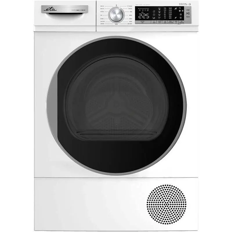 ETA 356390000C er hágæða varmadæluþurrkari sem er hannaður til að mæta kröfum nútíma heimila um afköst og orkusparnað. Með 9 kg hleðslugetu rúmar hann auðveldlega stærri þvotta, sængur og handklæði, á meðan varmadælutæknin tryggir að orkunotkun sé haldið í lágmarki.