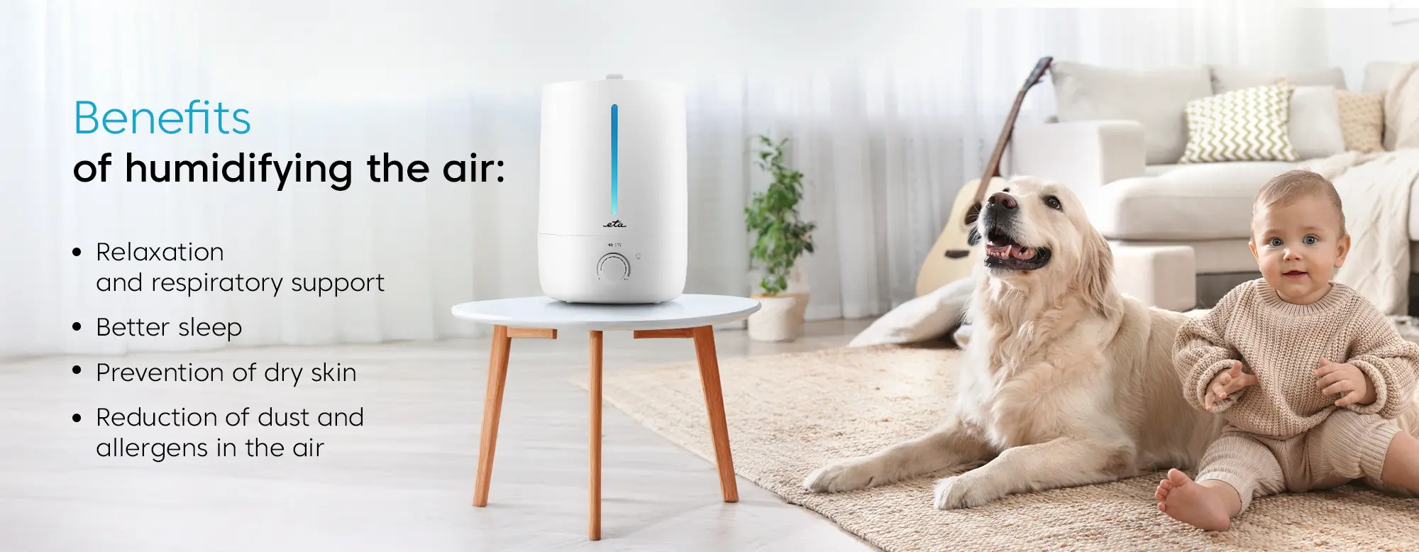 Stór 5 lítra vatnstankurinn er fjarlægjanlegur sem auðveldar áfyllingu, en tækið getur unnið samfellt í allt að 30 klukkustundir á einni fyllingu. Til að auka vellíðan er hægt að setja ilmkjarnaolíur beint í vatnstankinn og skapa þannig notalega stemningu með ilmi og litaðri LED baklýsingu. Hægt er að velja um sjö liti í lýsingunni eða festa á einum uppáhaldslit. Öryggið er tryggt með sjálfvirkri slökknun ef vatnið klárast.