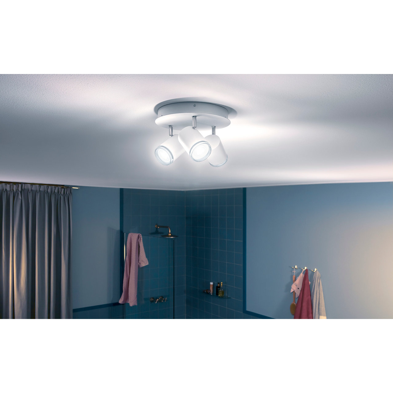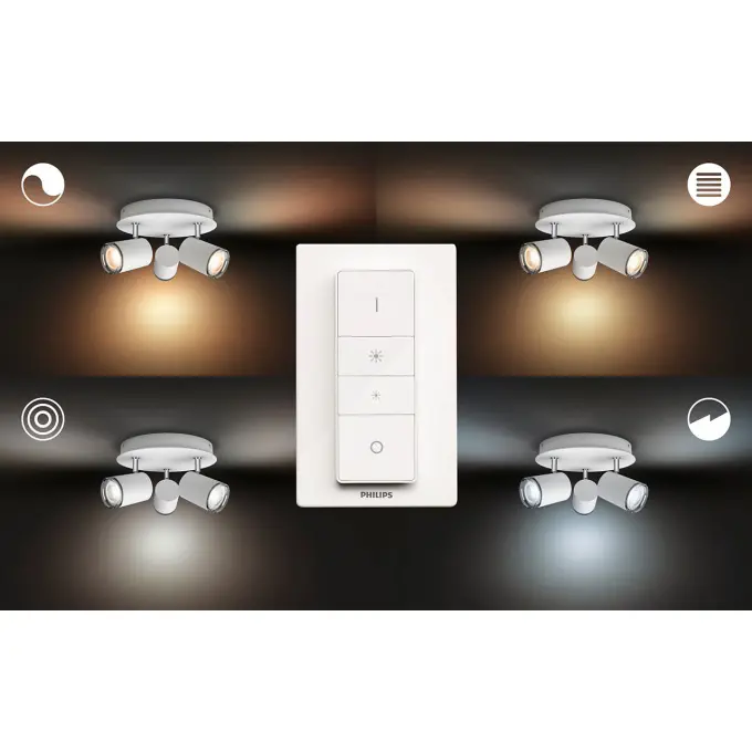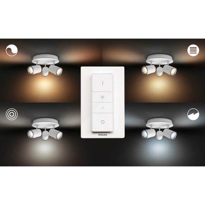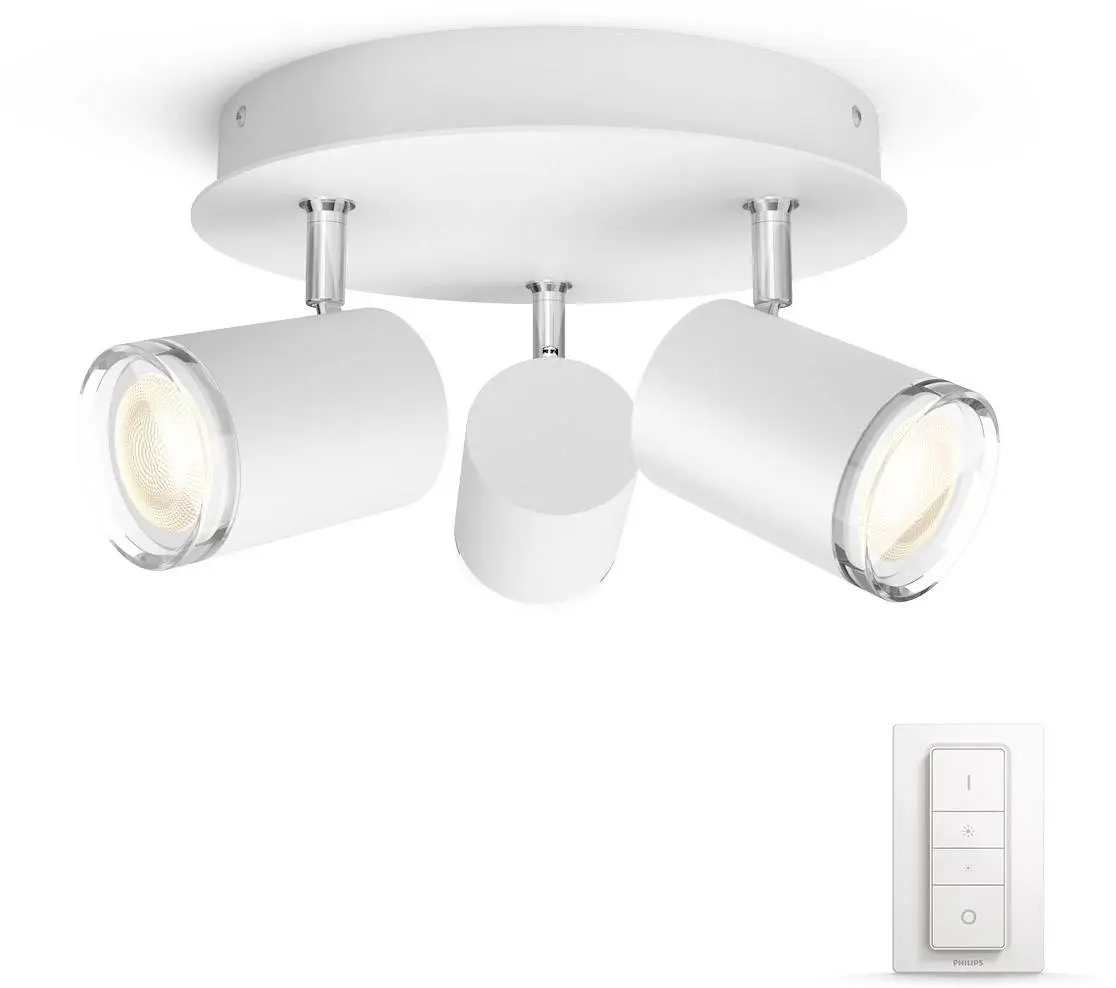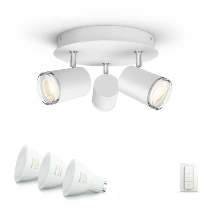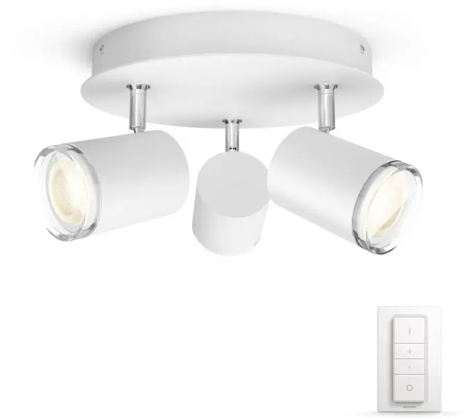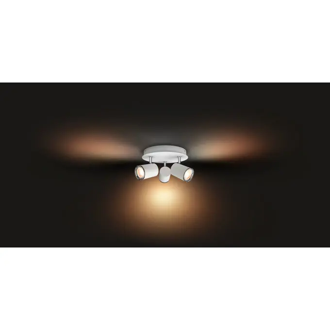 3 kastara loftljós frá Philips HUE, þráðlaus fjarstýring fylgir með til að stjórna ljósinu, hægt er að breyta lýsingu bæði í appi og með fjarstýringu, litasvið í perunum er 2200-6500 kelvin. Dimmanlegur - Já (í appi) Afl 5W (á peru) Ljósmagn 350lm ( í 4000K) Litarhitastig 2200-6500K Varnarflokkur IP44 að neðan Líftími 15.000 klst Stærð Ø 25 cm Hæð 12 cm