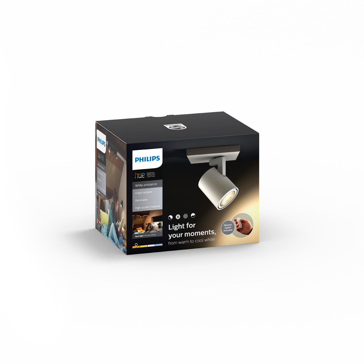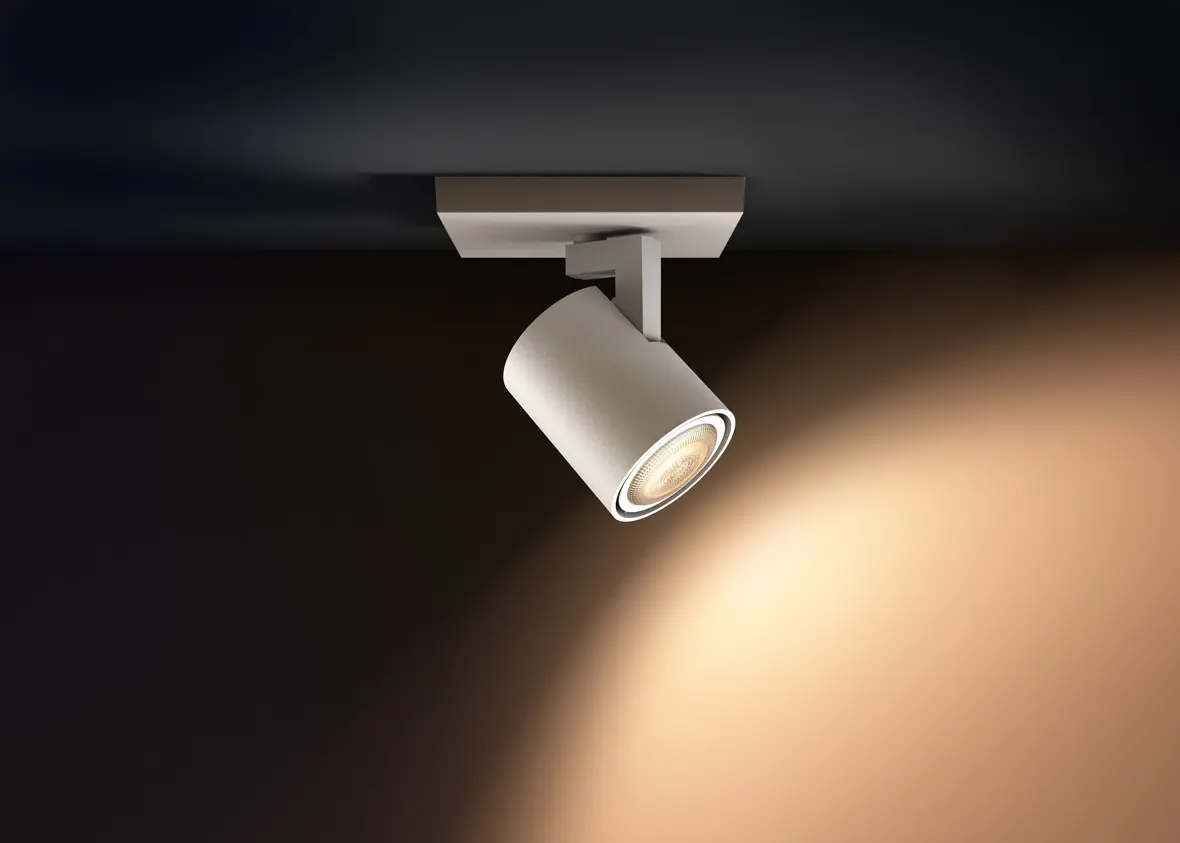 Spot kastari frá Philips HUE, hægt er að breyta lýsingu bæði í appi og með fjarstýringu. Dimmanlegur - Já (í appi) Afl 5W Ljósmagn 350lm ( í 4000K) Litarhitastig 2200-6500K Líftími 15.000 klst Breidd 9 cm Lengd 11 cm Hæð 10.7 cm