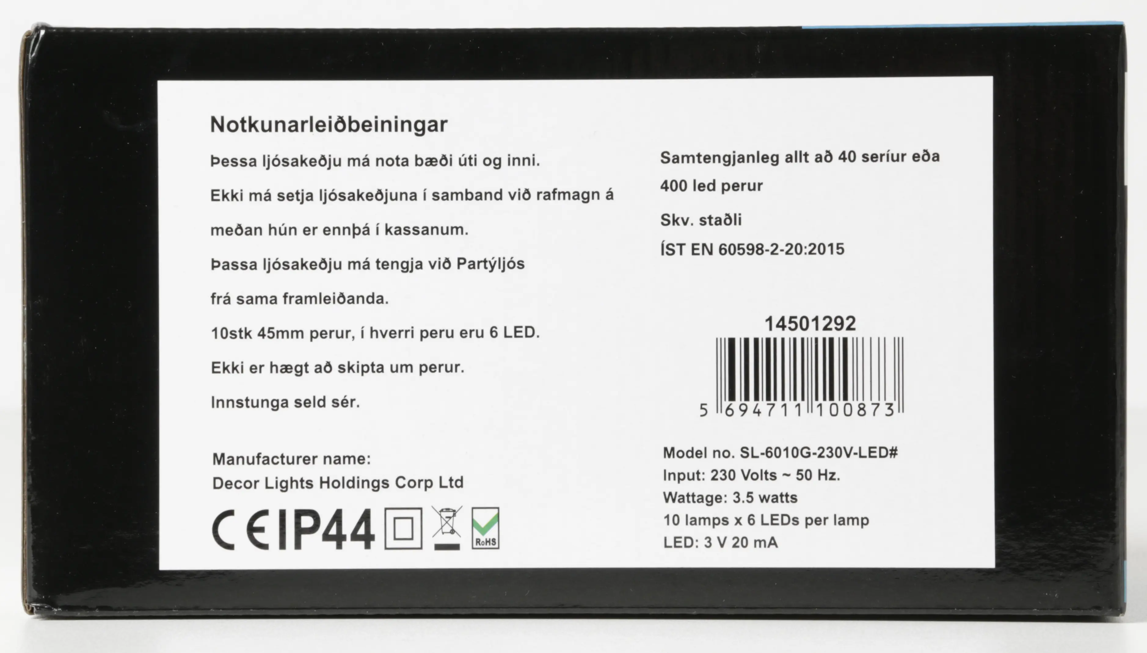 - IP44 – vatnsvarið fyrir utandyra notkun