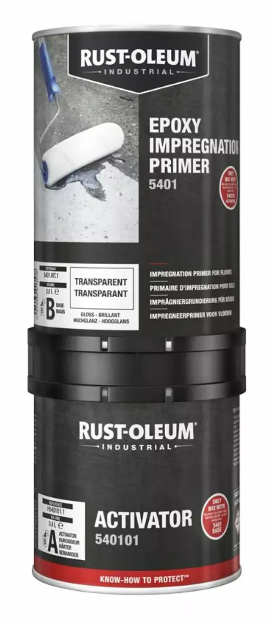 Rust-Oleum 5401 er hágæða, tveggja þátta epoxýgrunnur án leysiefna (solvent-free). Hann er hannaður til að smjúga djúpt ofan í steypu og önnur gljúp, steinefnarík undirlög. Með því að gegnbreyta yfirborðinu bindur hann ryk, lokar fyrir holrými og styrkir efsta lag steypunnar. Þetta gerir hann að kjörnum grunni áður en gólf eru máluð með epoxý- eða pólýúretanmálningu (s.s. Rust-Oleum 5500).