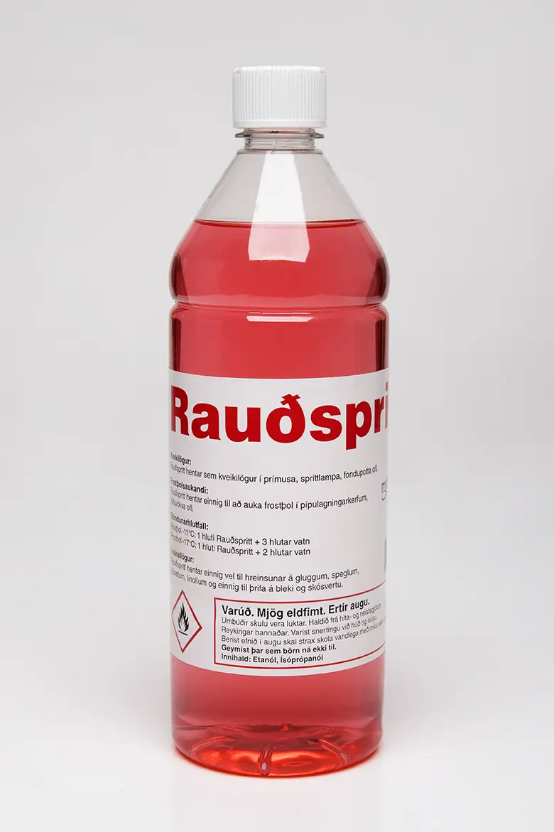 Rauðspritt 1 ltr. Hentar sem kveikilögur í prímusa, sprittlampa,fondupotta ofl. Hentar einnig til að auka frostþol í pípulagningarkerfum , rúðuvökva ofl.