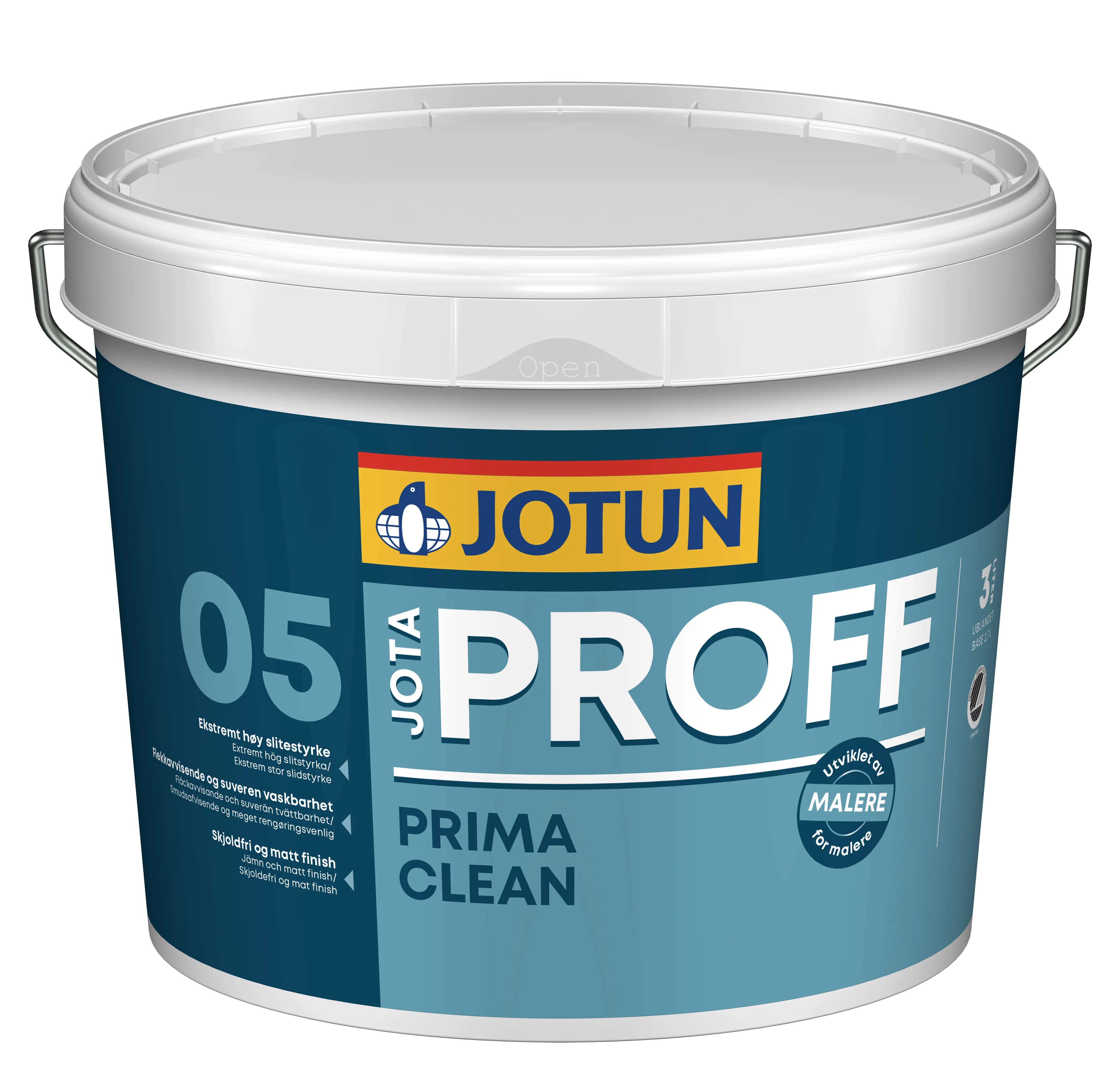 Jotaproff Prima Clean 05 er mött akrýlmálning sem er sterkasta veggmálningin sem Jotun framleiðir. Er í gljástigi 5%. Hentar vel þar sem mikið mæðir á, eins og í eldhúsum, forstofu barnaherbergjum. Mjög þægileg að vinna með, ýrist ekkert og þekur í tveim umferðum (þarf ekki að grunna yfir dökka liti). Gætið að blanda saman dósum með mismunandi framleiðslunúmerum til að forðast litamismun. Undirflötur þarf að vera hreinn, þurr og laus við fitu. Þrífið yfir með Jotun Spesialvask for maling. Fletir sem blæðing á sér stað af völdum sóts, nikótín eða rakaskemmda þarf að grunna fyrst með Jotun Kvist- og Sperregrunning. Lítri þekur 8-10 fm í umferð. Snertiþurrt eftir 1 klst. Yfirmálun eftir 2 klst. Ávallt er mælt með tveim umferðum. Þrif á áhöldum er með volgu vatni og penslasápu. Þessi málning er umhverfisvottuð af Græna Svaninum.
