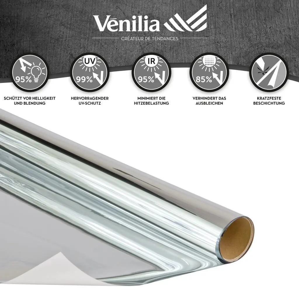 Statísk sólarvarnarfilma með spegiláhrifum. Auðvelt að festa inn í gluggann án þess að nota lím. Viðheldur sýnileika og verndar gegn hnýsnum augum og glampa frá sólarljósi