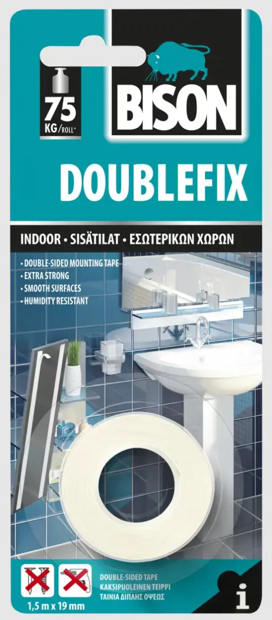Bison Double Fix er hágæða tvíhliða límband með svampkenndri áferð sem tryggir örugga og varanlega festingu á margs konar hlutum. Límbandið er tilvalin lausn til að festa spegla, sápuhaldara, skilti, króka og aðra fylgihluti á veggi án þess að þurfa að bora eða skemma yfirborð.