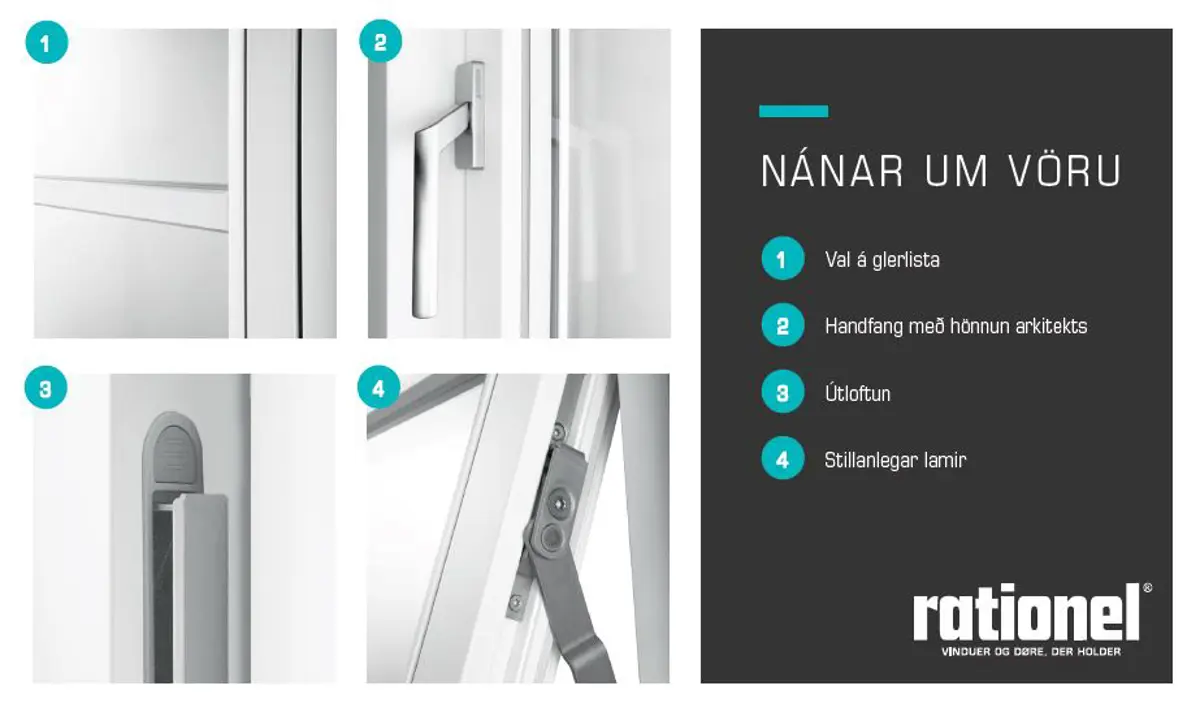 Að velja og kaupa glugga og hurðir er fjárfesting til framtíðar. Þess vegna er mikilvægt að velja það sem endist gagnvart veðri og vindi. Einmitt þess vegna leggur Rationel höfuð áherslu á endingu. Rationel prófar allar sýnar vörur með tilliti til einangrunargildis, hljóðkrafna og styrks. Allir gluggar Rationel eru vottaðir og slagveðursprófaðir fyrir íslenskar aðstæður. Gott og vandað gæðahandverk hefur einkennt Rationel glugga og hurðir síðan fyrsta framleiðslan fór úr verksmiðjunni í Sdr.Felding árið 1954. Rationel er byggt á raustum grunni og er í dag alþjóðlegt framleiðslufyrirtæki með söluskrifstofur í mörgum löndum.