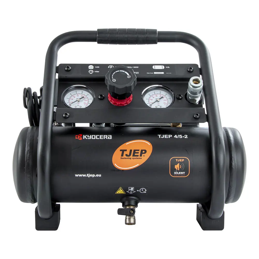 Loftpressa Tjep 4/5-2 hljóðlát 2ja cyl - 0.5Hp 9 Bar 131 psi Tankur 3.8L Hávaði (LWa) - 69dB Hávaði (LPa 4M) - 56dB - mjög hljóðlát FAD @ 0 bar* 49 liter/min FAD @ 2,8 bar 25 liter/min FAD @ 6,2 bar 17 liter/min Stærð (L×B×H): 385 × 385 × 370 mm Þyngd: 12 kg Hestekræfter 0,4 kW / 0,5 hk Netspænding 230 volt Maks. tryk 9 bar / 131 psi FAD @ 0 bar* 49 liter/min FAD @ 2,8 bar 25 liter/min FAD @ 6,2 bar 17 liter/min Tank 3,8 liter Lydniveau (LpA, 4m) 56 dB Lydniveau (LwA) 69 dB