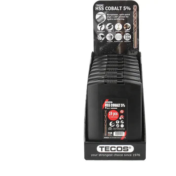 Boroddarnir eru slípaðir í 135° M35 stál , Kóbalt 5% Framleitt í samræmi við DIN 338 Inniheldur 19 stk: 1 - 1,5 - 2 - 2,5 - 3 - 3,5 - 4 - 4,5 - 5 - 5,5 - 6 - 6,5 - 7 - 7,5 -8 - 8,5 - 9 - 9,5 og 10 mm