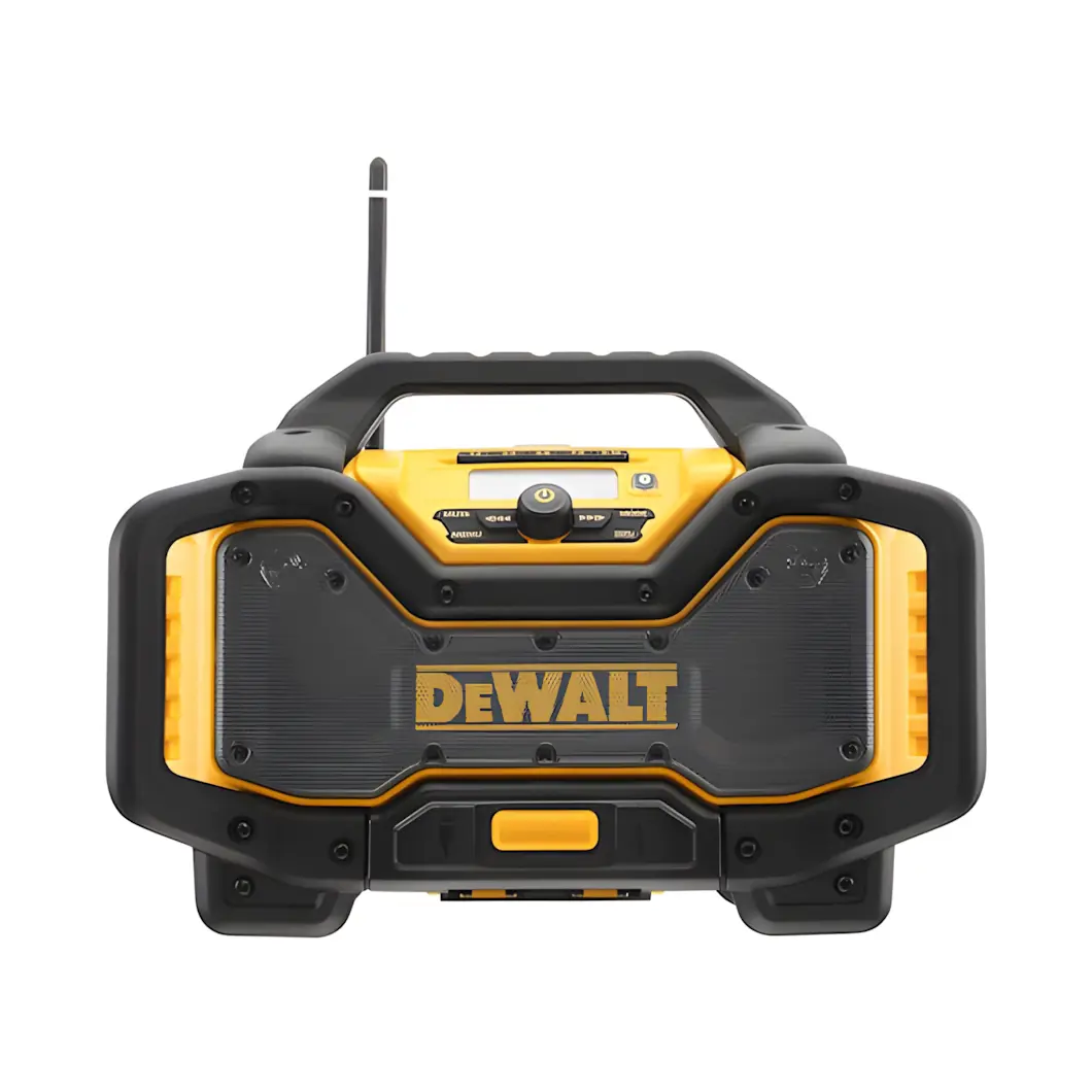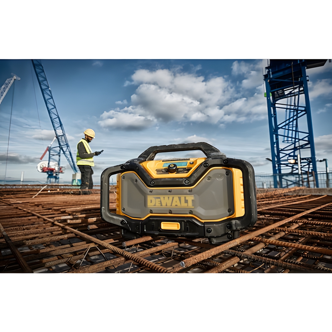 18V útvarp frá Dewalt Bluetooth DAB(+)/FM 3,5mm tengi USB tengi Með veltibúri Getur notað 10,8V, 12V, 14,4V og 18V Dewalt rafhlöður Kemur með rafmagnsnúru 230V Án rafhlöðu og hleðslutækis