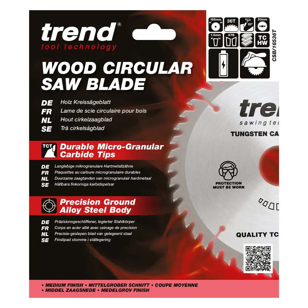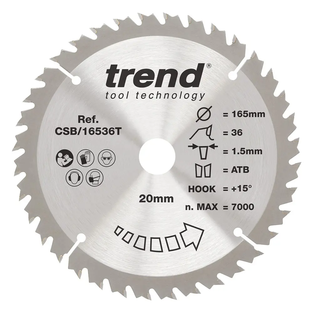 Öflugt og nákvæmt 165 mm hjólsagarblað frá Trend með 36 karbít-tönnum sem skilar hreinum og sléttum skurði í tré og plötuefni.